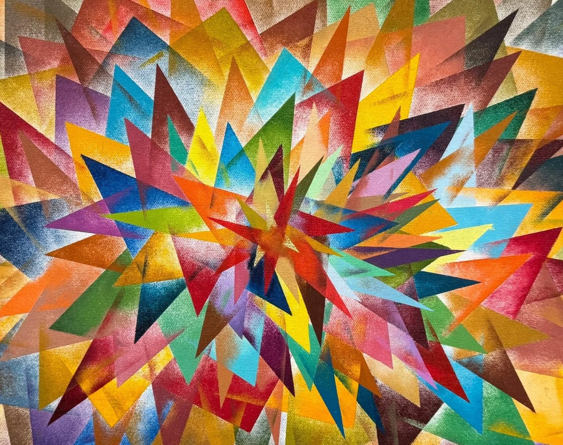 The monochromatic schizm, that divides dissected shapes of muted reds and fading yellows, pierced by antagonistic orthogonal shapes, lines and darts attempts to convey two souls divided with emotional enmity, the slow decay and loss of love, ensuing indifference and perhaps emptiness wrought by love lost.